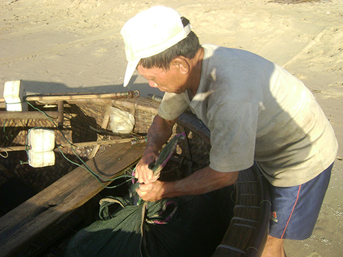 Người cuối cùng về bến hôm ấy là ông Lê Văn Sanh. Không đủ tiền mua ghe, ông chấp nhận đánh lưới bằng thúng chai. Cả 2 bàn tay ông đã bị rút lại, co quắp, nhiều ngón không còn. Loay hoay mãi, ông vẫn chưa buộc được bọc lưới để mang về nhà. "Ra biển suốt đêm nhưng mớ cá đánh được này có lẽ chỉ bán được 50.000 đồng. Vậy là may rồi, đêm trước còn chẳng được con nào. Gắng làm để dành dụm cho đứa con thứ hai ra thành phố học lớp 10, chứ cả vợ chồng đều bị bệnh, biết kiếm đâu ra tiền..." - ông tâm sự.