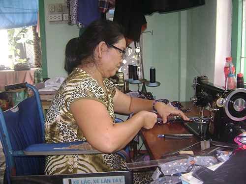Hơn 15 năm nay, chị Trần Thị Sanh ngồi xe lăn may đồ để mưu sinh